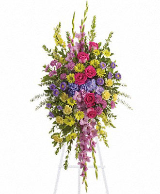 The bouquet is made up of lavender gladioli, pink roses, chrysanthemums, snapdragons, carnations, daisies, hydrangeas, and assorted greens. This merry collection is not only a vivid display of colors but also an expression of warm emotions for the one you lost.