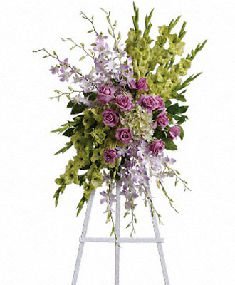 Dealing with funerals is never easy, and for most people, the grieving process is a deeply personal journey. If it were up to us, we would prefer to mourn in solitude, cherishing the memories of our loved ones who have passed on. However, it's important to remember that a funeral is not about us - it's about honoring and saying farewell to those who are no longer with us. It is an opportunity to reflect and show support to the grieving family. If you're looking for a way to express your condolences and offer strength during this difficult time, we recommend the Heavenly Sentiments Spray. \n\nThis exquisite arrangement features a variety of flowers, each with its own special meaning. The Heavenly Sentiments Spray boasts fresh roses, a timeless symbol of love and devotion, as well as luxurious blooms such as orchids, hydrangea, and gladioli in heavenly shades of green, purple, and lavender. Orchids have been revered since ancient times for their beauty, peacefulness, and thoughtfulness, while hydrangeas and gladioli represent understanding, sincerity, and strength. The Heavenly Sentiments Spray is not only visually stunning, but it also conveys sentiments of love and peace - the very things we wish for our loved ones who have passed on. \n\nOur local florist carefully handcrafts each Heavenly Sentiments Spray and places it on a classic easel. We offer same-day delivery throughout Canada and the United States, ensuring that the flowers you receive are fresh and vibrant. You can also book in advance, and we will be happy to serve you. Show your support and extend your condolences with the Heavenly Sentiments Spray.