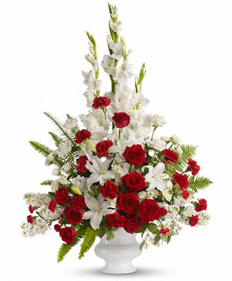 Featuring a classic blend of radiant reds and gleaming whites, this bouquet is a regal masterpiece with hand-picked white and red roses, carnations, oriental lilies, gladioli, and eucalyptus. Red roses symbolize true love, while white roses represent purity and unity. Gladioli signify faithfulness and integrity, and oriental lilies signify pure-hearted love and affection. Carnations represent fascination, love, and admiration, while eucalyptus symbolizes protection.