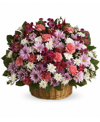 Featuring a soft and comforting assortment of dazzling flowers, this bouquet is bursting with vibrant colors, including pretty pink carnations, white cushion spray chrysanthemums, lavender button, daisy spray chrysanthemum, and alstroemeria. It is a true representation of love, affection, devotion, and sympathy that's sure to leave the recipient speechless.