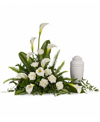 Are you currently in the midst of arranging a funeral and in need of fresh flowers for the memorial service? Look no further than Stately Lilies. With a longstanding association with funeral homes, our neutral-colored garlands are the most appropriate choice for this somber occasion. \n\nOur artfully arranged bouquet features regal calla lilies paired with virtuous white roses, surrounded by soft lush-green leaves of aspidistra, calathea, and sword ferns, as well as tropical foliage of Italian ruscus and salal leaves. While minimalistic in appearance, it is enough to express sincere sentiments for the departed soul. \n\nThe ivory-centric presentation exudes elegance and poise, without any unnecessary drama or flamboyance. The fresh white lilies and roses symbolize the purity, humility, and virtuousness of the person you lost, while the inclusion of ferns portrays the sincerity and genuine feelings felt by the mourners. Lastly, the calathea serves as a nod to the Catholic belief in the Hereafter, as it is commonly regarded as a symbol that says to turn over a new leaf. \n\nStately Lilies in all its pearly white and emerald green glory never takes away the spotlight from the urns or photographs you may have on display. We recommend purchasing these flowers if you wish to express heartfelt sympathies for the demise of a steadfast pillar of the community. \n\nIf you're interested in placing an order, we offer same-day delivery to anyone who orders before 1:00 pm in the recipient's time zone!